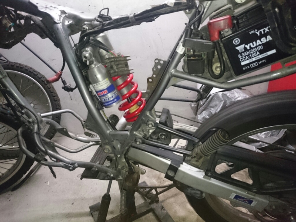 管理人は減衰力調整可能なXR250Rのサスをワンオフ加工して取付けてる。