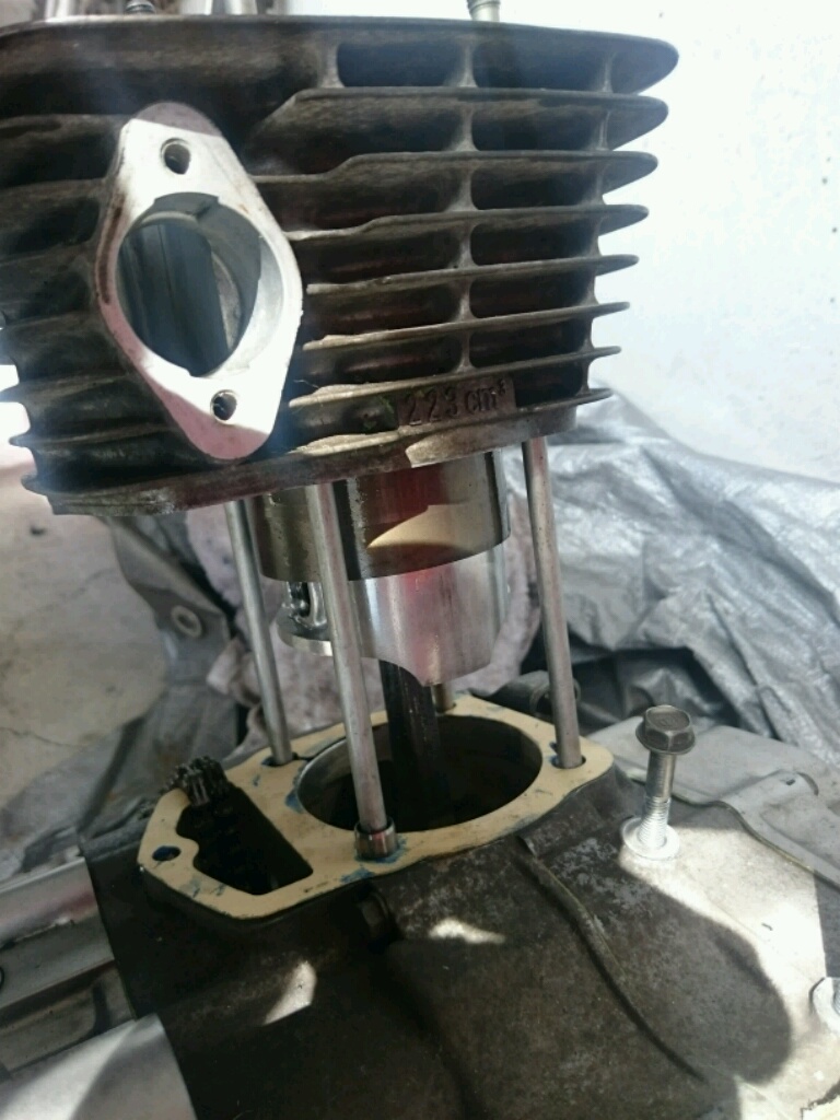 ピストンリングが出ているので、単気筒エンジンだと一個しかないので手で押さえ込んでしまう人が多いが、これをやってしまうと、オイルリングやセカンダリリングを破損したり、位置がずれてしまう場合が多いので、ケチらずに特殊工具ピストンリングコンプレッサーを使用したほうがアンパイだ。