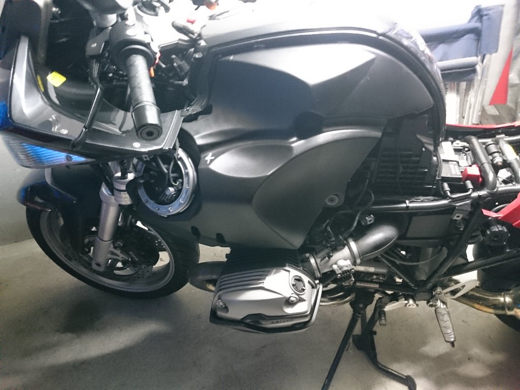 ドイツのバイクは盗難防止ボルトをカウルのボルトにまで使っているので、特殊なトルクスビットで外す。フルカウルなので、サイドカバー、タンクカバー、シートを外す。