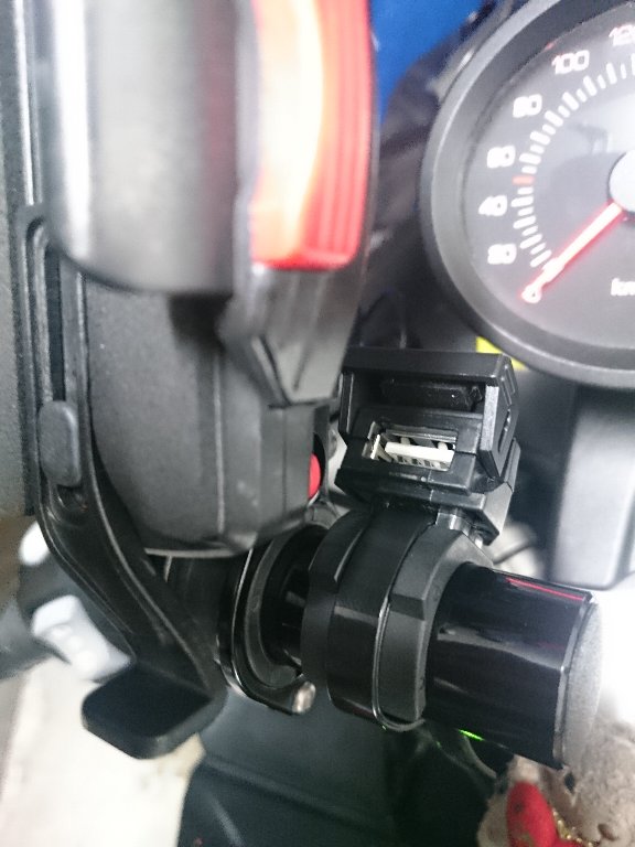 電源確保、スマホホルダーセット確認、USB2.1A急速充電確認して取付終了。