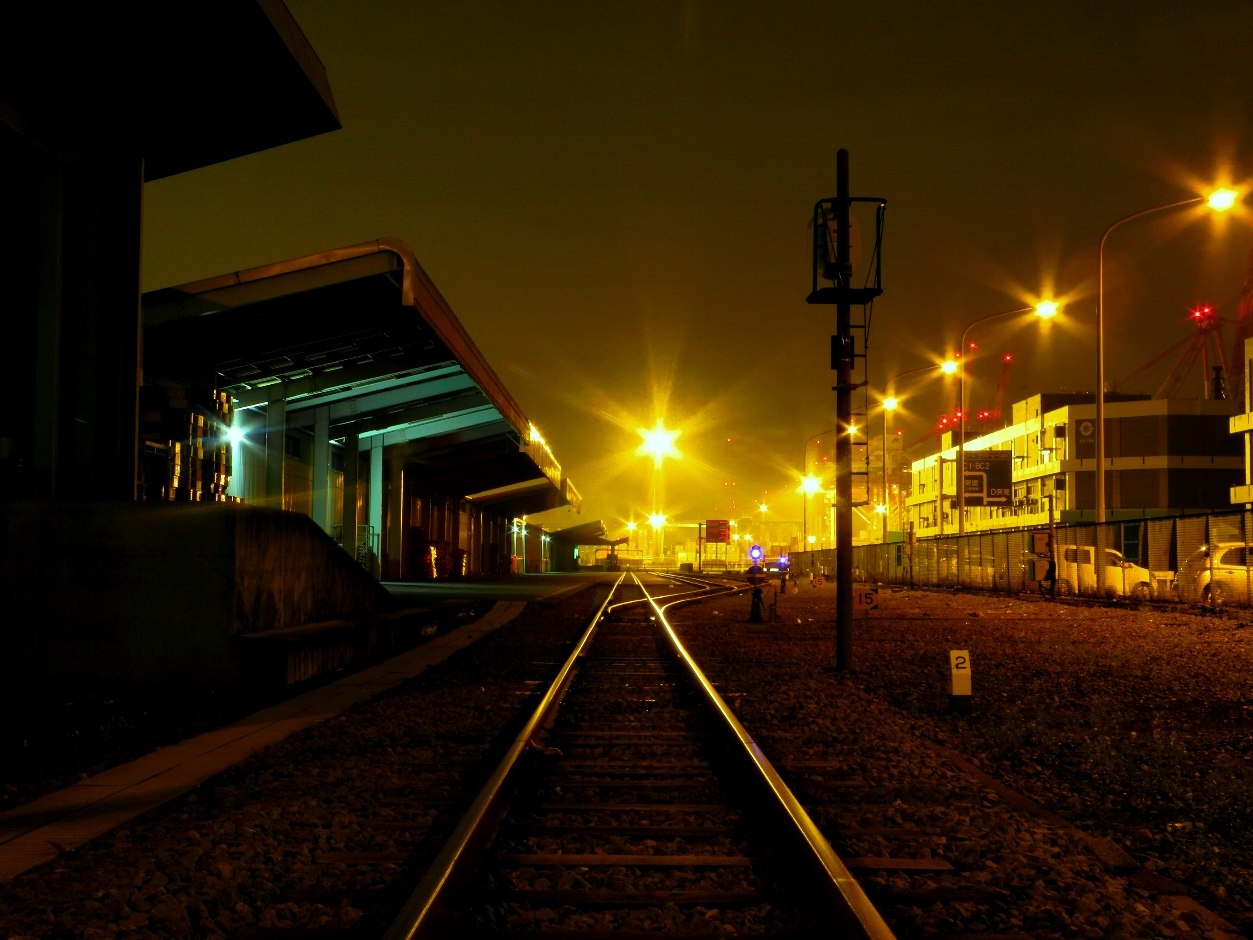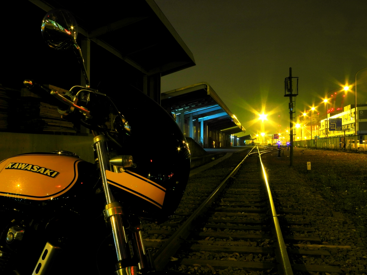 貨物バックヤードのナトリウム灯が照らす深夜の怪しい無人駅とゼファー1100。