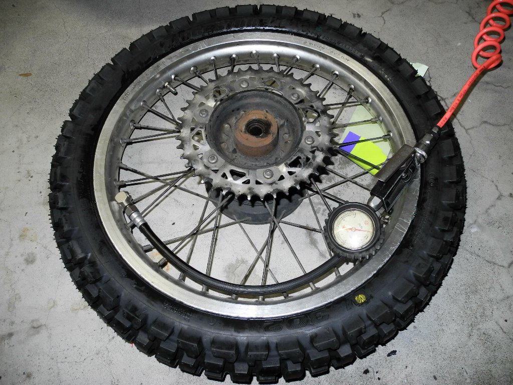 タイヤを組んだら、ビードをしっかり落とすため、エアコンプレッサ