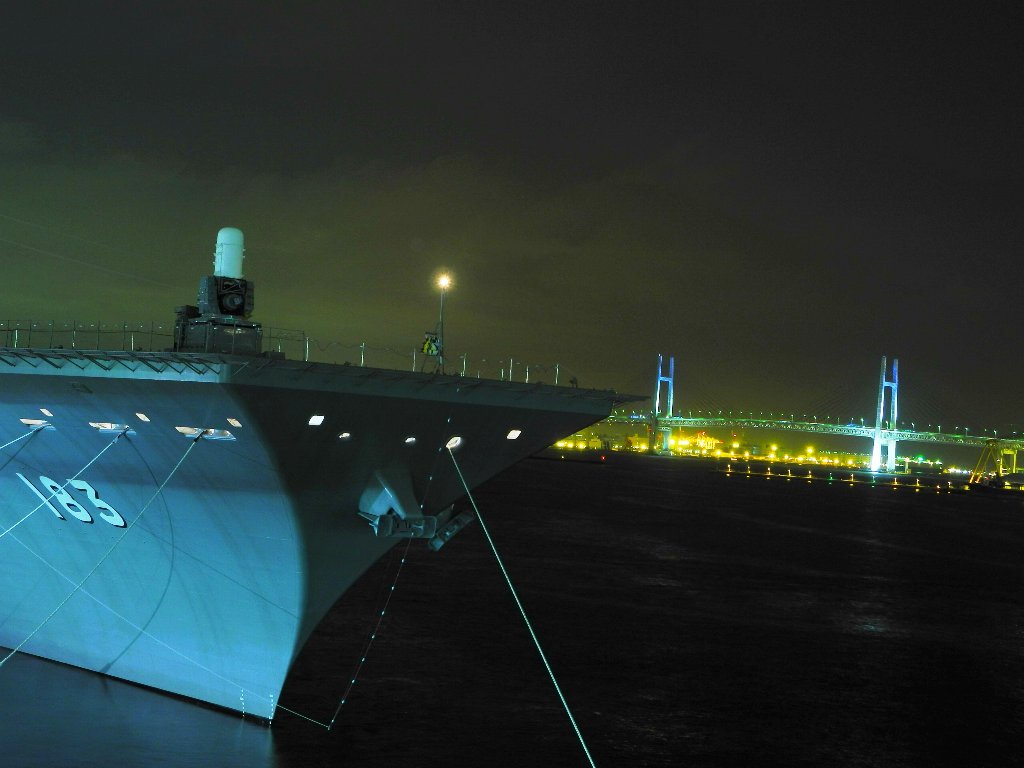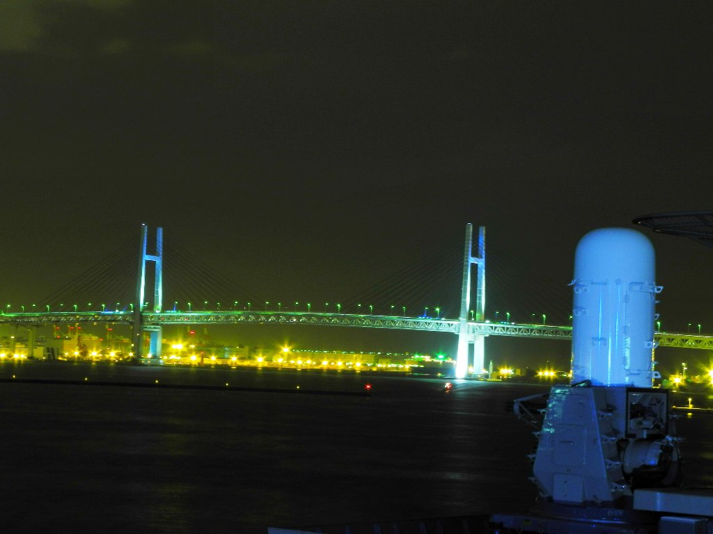ファランクス20mm機関砲と横浜ベイブリッジ。横須賀なら米海軍の空母がいつもいるから普通だが、みなとみらいでこの組み合わせはめったにない。