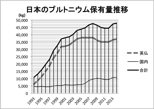 日本は2003年末に「余剰プルトニウムを持たない」との政策を宣言しているにも関わらず、ストックは44.6トンを保持し、10トンを青森県六ケ所村に保持し残りは英仏に保管している。