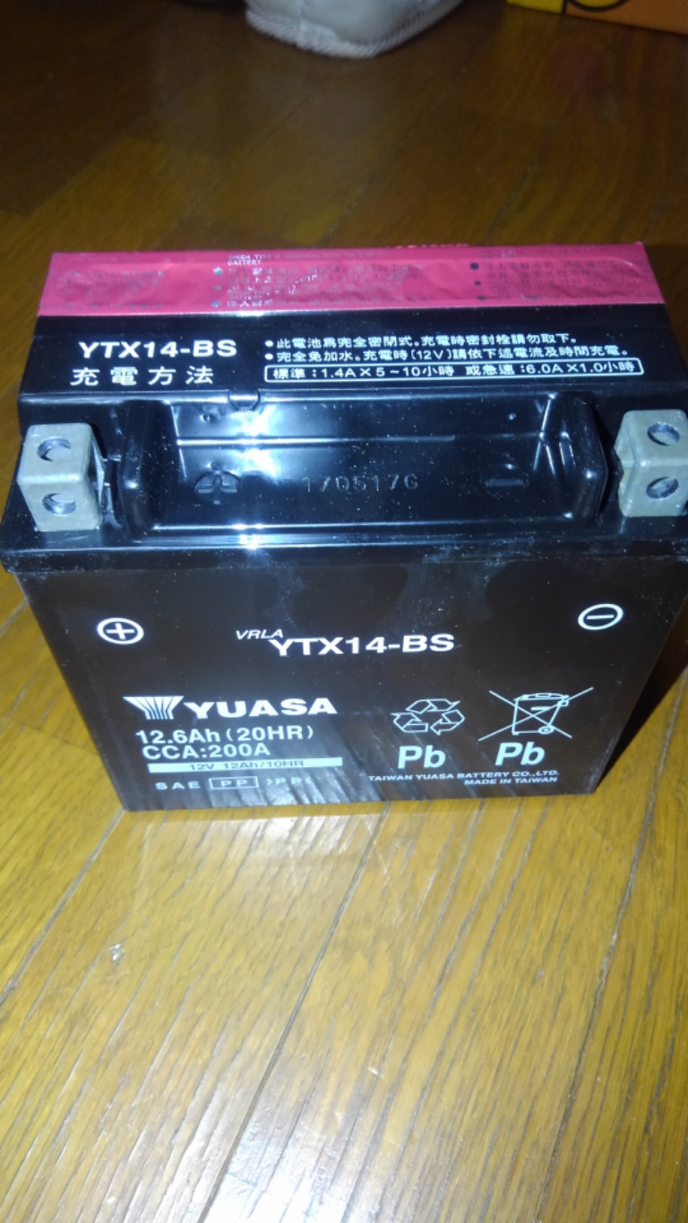 台湾YUASA製のバッテリーを購入。 なんと14AHの大型のシールドバッテリーが6000円ちょっと。