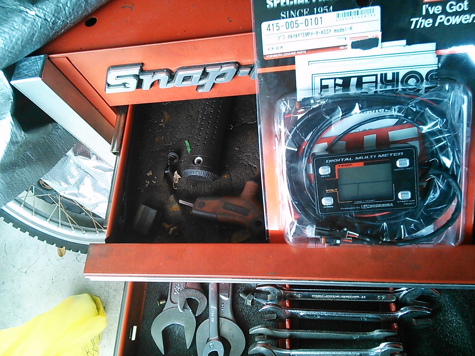 ヨシムラのオイルテンプメーターをゲット。今日は午後からケーキ屋さんで仕込みなので朝から密かにガレージで取付けです。