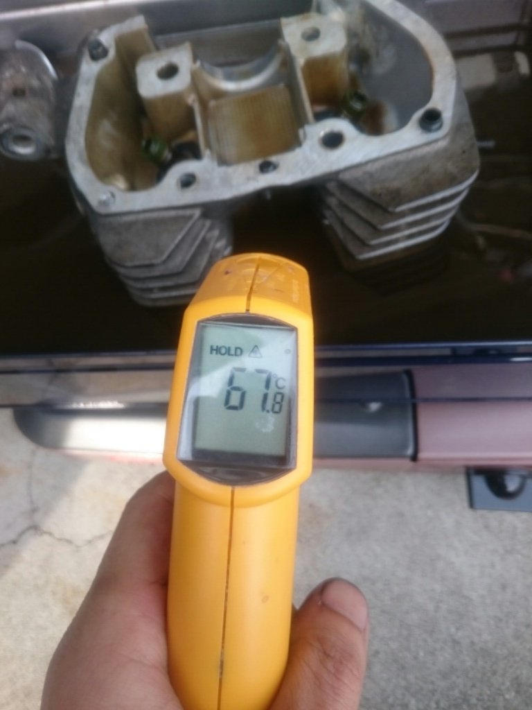 シリンダーヘッドの燃焼室、ピストン、バルブ、シリンダー下のカーボンをお風呂できれいに洗います。