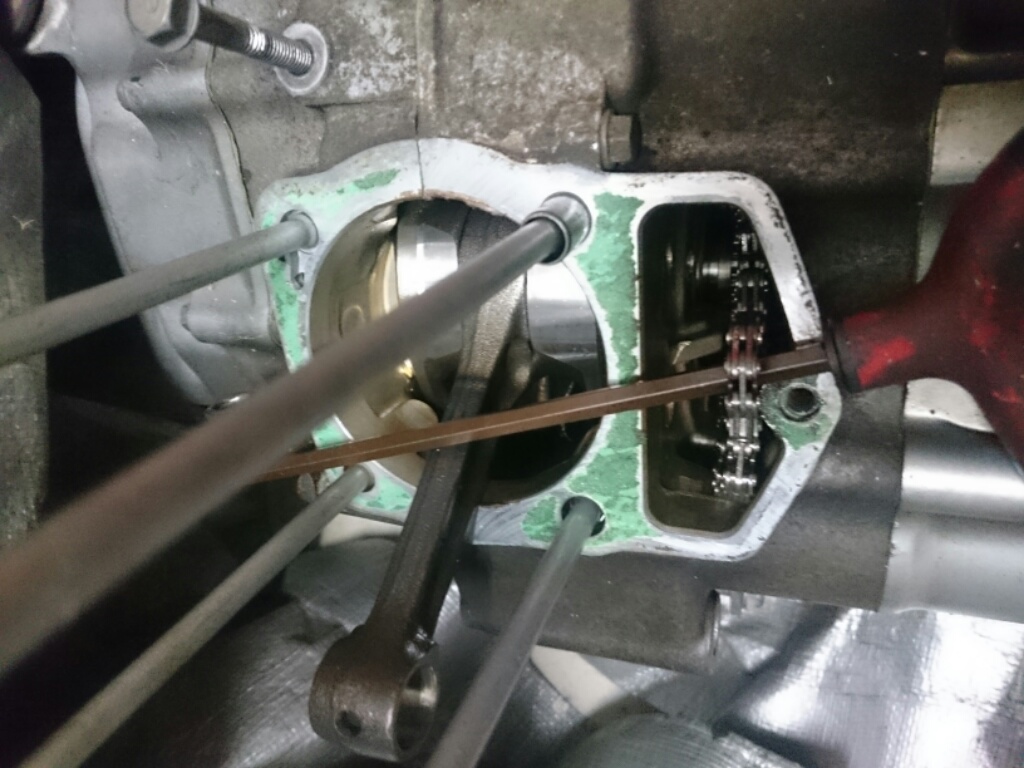 さらにクランクケース側のガスケットはエンジン内部に落ちる可能性があるので慎重に削らないとならない。