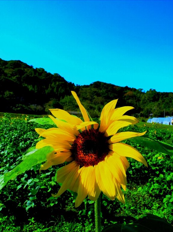 ゆるりとした田園風景の中、ひまわりが咲いている。