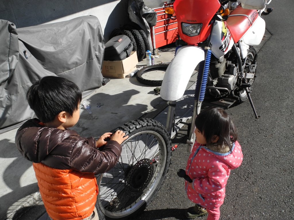 問題がないことを確認しタイヤにチューブ組み込み、ホイールを組み立てます。ここで近所の糞ガキどもが大集合したので手伝わせます。